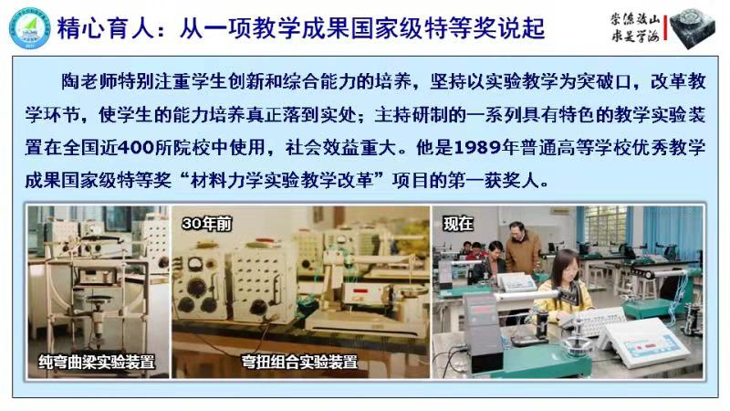 在上世纪八十年代教学改革浪潮中,陶老师勇于重整和创新力学实验教学课程,为我校力学实验课程的设立与推广打下坚实基础,在全国形成了南航影响。