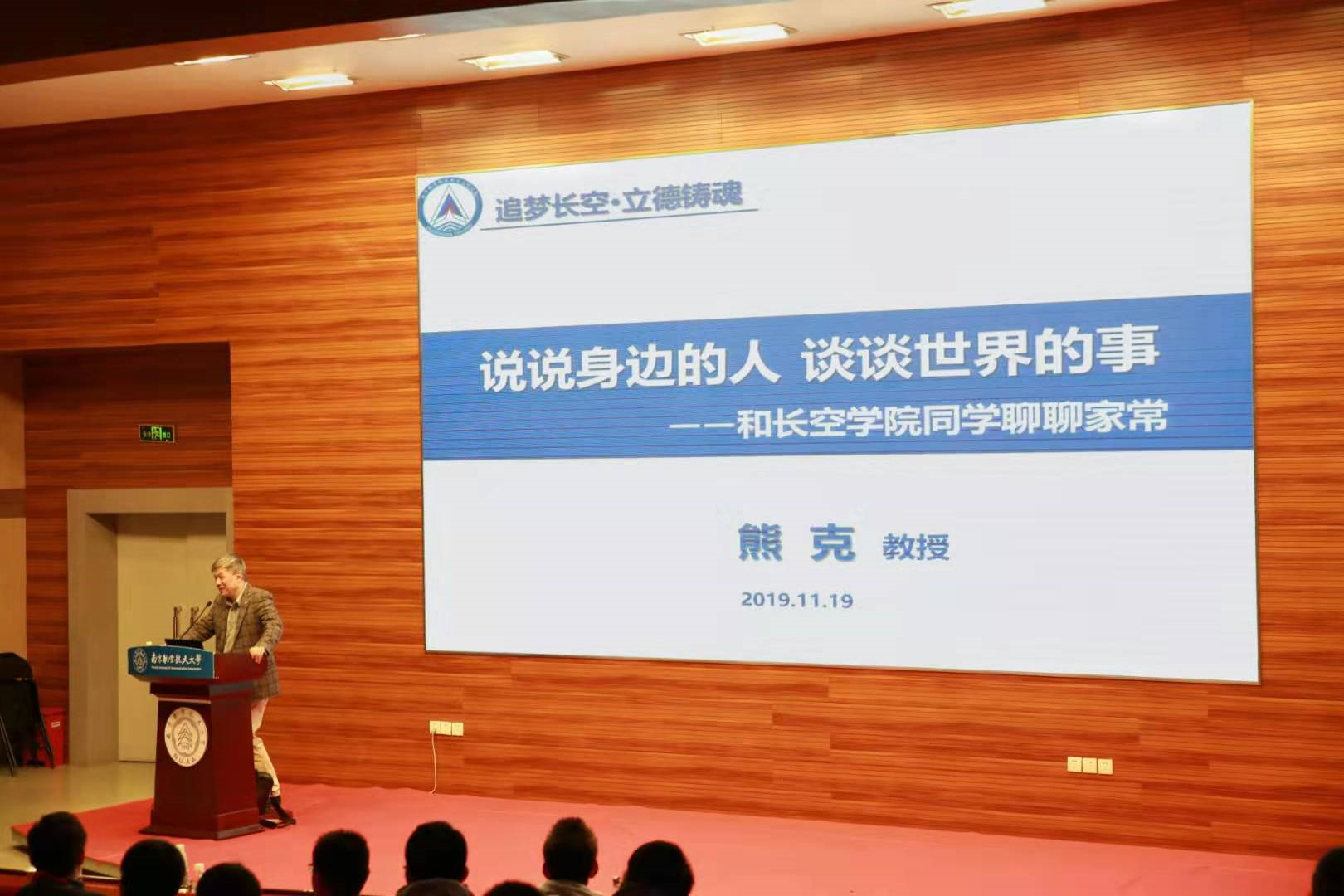 11月19日下午,365英国上市公司官网“追梦长空 立德铸魂”讲堂在一号楼四楼报告厅举行,校长助理熊克为长空师生做了《说说身边的人,谈谈世界的事——与365英国上市公司官网学生聊聊家常》主题讲座。365英国上市公司官网常务副院长蒋彦龙、副院长张林和近400名学生参加本次讲座。