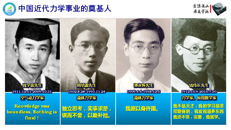 熊克介绍了我国近代力学学科的四位奠基人:钱学森先生、郭永怀先生、周培源先生、钱伟长先生。空气动力学家钱学森先生说“knowledge is boundless,nothing is final.”;流体力学家周培源说:“独立思考,实事求是,锲而不舍,以勤补拙”;流体力学家郭永怀说:“我愿以身许国”;力学家、应用数学家钱伟长说:“我不是天才,我的学习是非常勤奋的,我发现很多东西我还不懂,需要,我就学。”一言一语,皆为我辈之师。