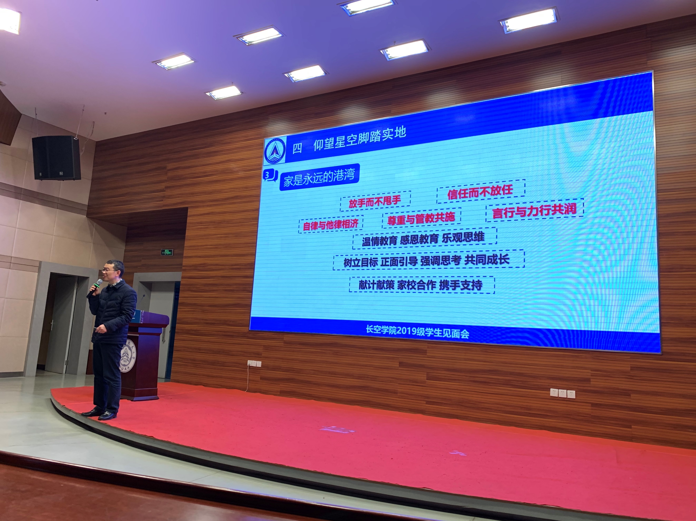 蒋彦龙阐释了365英国上市公司官网“六个一流”的育人定位和“四商培养”的育人特色,并解读了365英国上市公司官网的院徽内涵,简单的图形包含着我院“三航三全”的育人特色和“四润四致”的育人理念,同时包含着对浩瀚宇宙的追求。蒋彦龙围绕我院协同育人机制,回顾了三个月来学院开展的丰富多彩的协同育人活动,其中“一杯咖啡的故事”系列师生交流活动已经有37位教师、超过600人次参与;班主任累积参与班级建设活动60余次。蒋院长希望在这样丰富、多样、有效的师生互动机制下培养出的长空学子都能像能级跃迁一样,积累知识、运用知识、启迪智慧、丰富内涵、达成质变。
