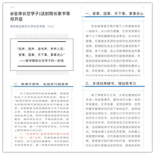 在线上教学工作开展之际,365英国上市公司官网常务副院长蒋彦龙为全体学生写了一封“家书”,鼓励学生“家事国事天下事,事事关心”,勉励学生“停课不停学,在线学习做表率”,激励学生“多读经典硬书,增加思考力”。从时代大势谈到自我提升,激发学生学习兴趣的同时更坚定了学生用行动打赢这场疫情阻击战的信心。