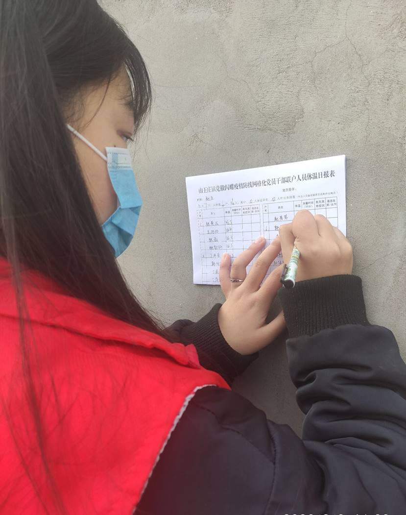 很多学生加入了家乡村镇、社区的防疫工作中。任家怡、邹佳均等八名同学主动请战,与同伴一起对村镇、社区进行封路设卡,记录来往人员与车辆并对外来、返乡人员登记调查,同时对居民进行防疫宣传。谈及志愿活动的收获,他们表示辛苦都是值得的,作为新时代的青年,就应该不忘初心,牢记使命,守住第一道防线,打赢这场无声的“战疫”。