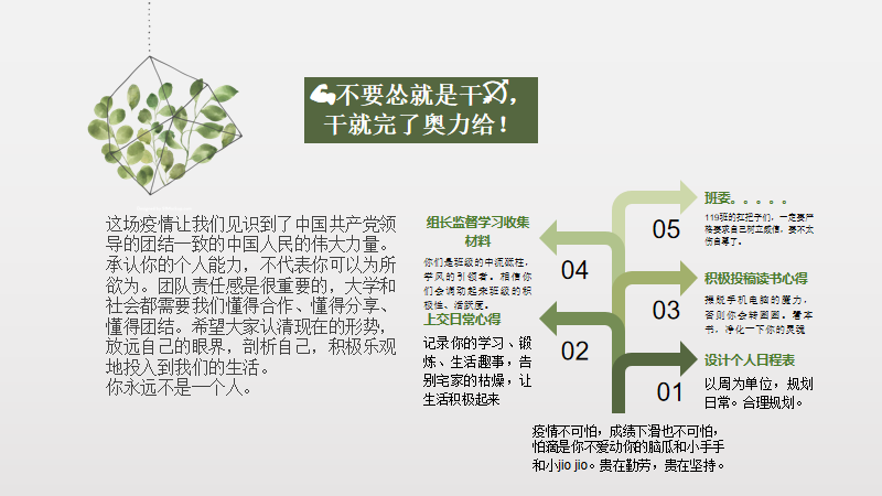 你们的班会开得很好,对疫情的关注体现了当代青年的家国担当,对学习的重视抓住了大学生的根本任务。特别是互助学习小组的实施,营造了一种互学互助、你追我赶的良好氛围。今日的努力拼搏就是为了明日更好地报效祖国。
