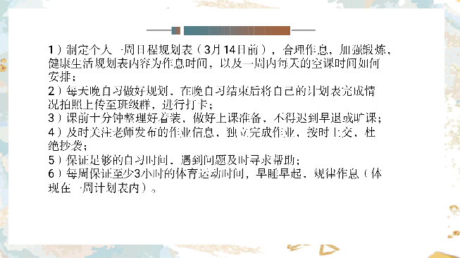 104班班会就近三周同学们学习中出现的问题进行了分析,如部分同学因不能及时起床错过上午一二节课程、作业无法按时提交等,提醒大家调整作息时间和学习状态,重视线上学习。
