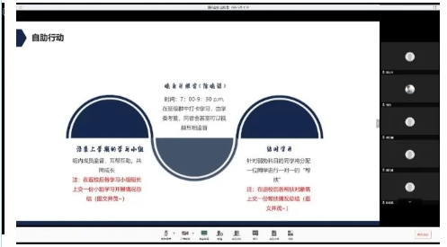 001班、002班的两位班长向同学们详细介绍了“三自”行动,并借助优秀同学居家学习的例子对同学们如何自主、自律学习提出了建议。