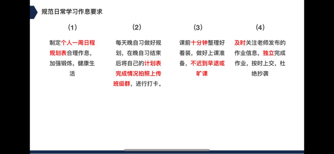 线上学习的环境相对来说比较放松,尤其需要同学们用自律意识和自律行为来约束自己,锤炼自己的意志力、行动力。“三自”班会上,很多班级对近期线上学习中同学的“自律性“进行了总结,提出了建议和要求。