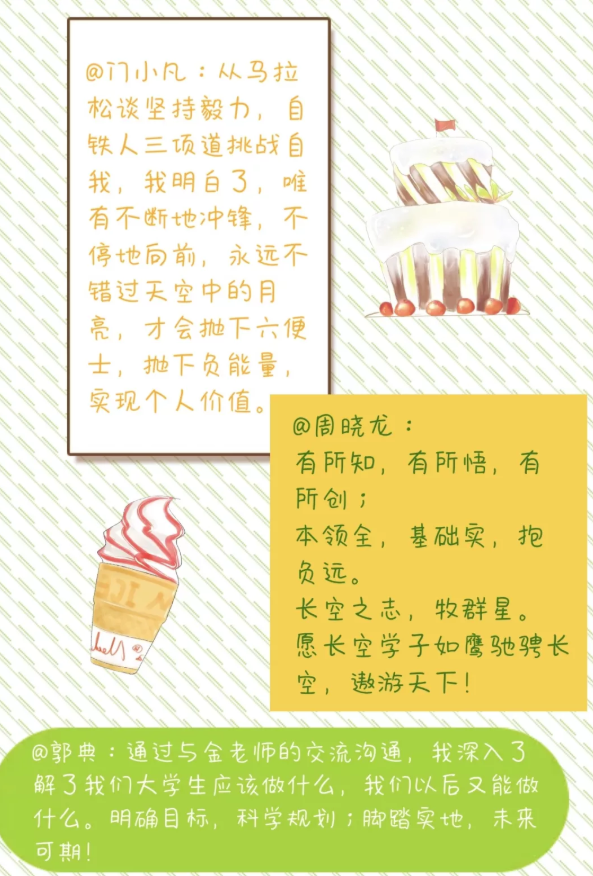 第八期的主讲老师是能源与动力学院的金志光老师。金老师以“全马”为切入点,跟同学们强调了毅力与奋斗对于个人发展的重要性:“学习就像跑马拉松,唯有坚持不懈,才能到达成功的终点。”作为一名南航“学长”,他以亲切的口吻回忆了自己的人生故事,分享了自己的人生阅历。金老师最后用一段朴实的话语语重心长地告诉同学们:“珍惜大学时光,过一个丰富多彩的大学生活,希望你们能在大学四年中拥有健康的身体,取得优异的成绩。”金老师怀揣着一颗真诚的心,温暖了长空学子,指明了前行的方向。