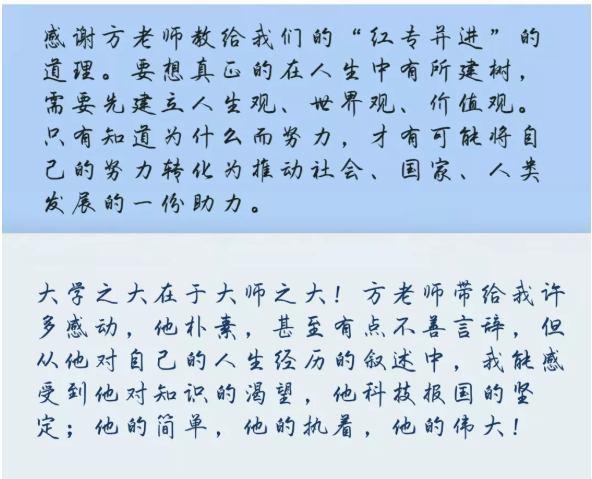 方贤德老师表示自己从小的理想就是当一个科学家,他希望能够给社会做出更多的贡献。方老师提到,小时候因为贫穷没有太多机会学习,于是就自主进行实验田的研究工作。冬天,他一边放牛羊,一边找机会学习。等到上大学的时候,可能是学校看中他的成绩和做实验田研究的经历,就选择了他,于是他就开始了飞行器环境与生命保障工程的专业的学习。由于建筑环境与能源利用工程专业与其本科专业的学科基础最为接近,大学毕业后,方老师选择在清华大学深造该专业,此后方老师又选择进入中国科学技术大学学习研究以便寻求更好的科研条件,后来又选择踏上教师岗位,回到母校,重新从事飞环领域的研究工作。通过这些经历,方老师告诉同学们,不要把专业看得太重,专业之间实际上是没有严格界限的,知识的应用也不应该仅受限于某一个专业,而要扩展到更多的领域。方老师以自身将建环中做空调的研究思路应用到航空领域为例,说明学科间是相通的。方老师认为大学的学习更需要注重自学能力的培养以及自己解决问题的能力。