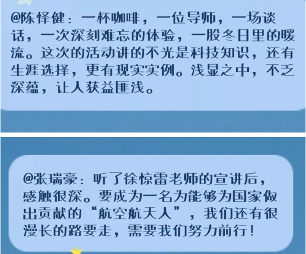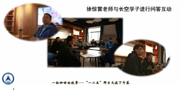 世间哪得心安处,咖啡交流不负卿。第十六周咖啡的香醇未变,带给我们的故事和启迪在变。荡胸生层云,戴宁老师讲述了属于航空航天人的骄傲,引导同学们融通致用;一腔热血勤珍重,徐惊雷老师则用自己的实际行动诠释了什么叫做“坚守”,劝勉同学们要守得住本心。
