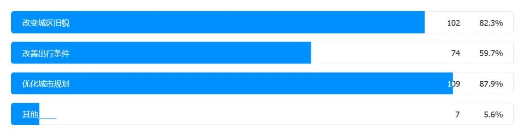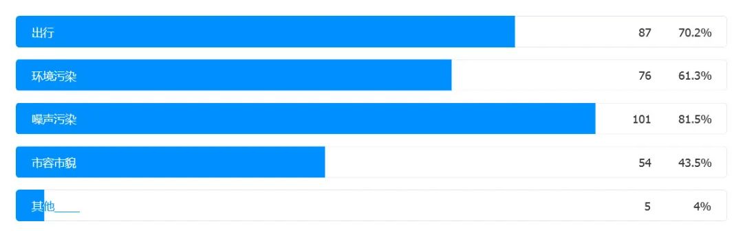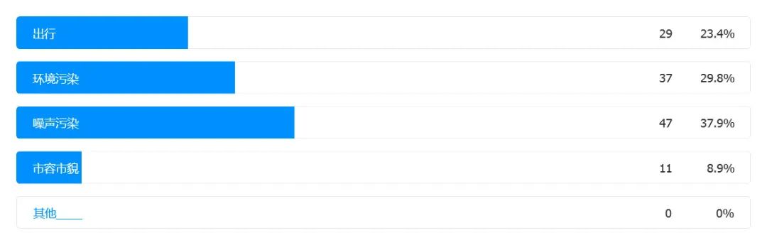 其中,噪声污染是大家认为最难以忍受并且希望得到改善的,渴望改善环境污染和出行条件的受访者也占多数。
