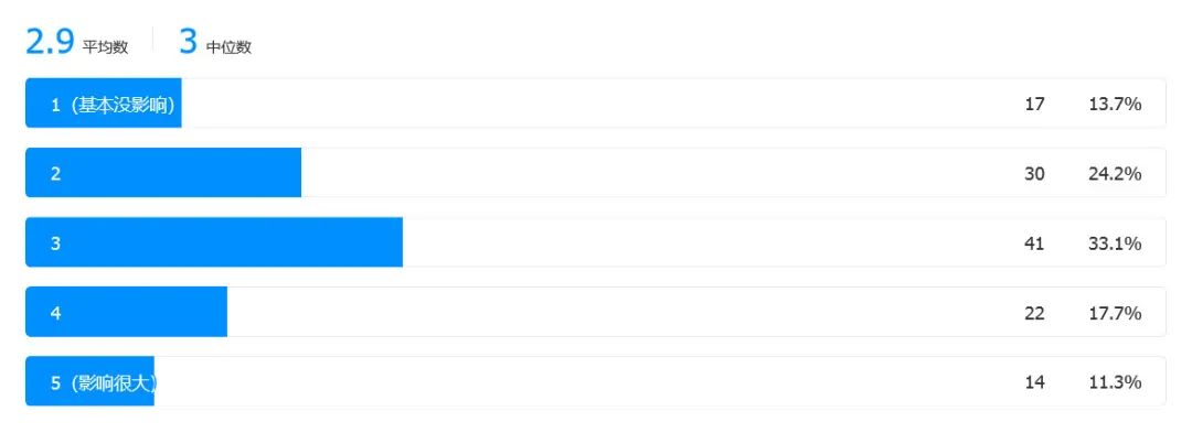 调查发现,绝大多数的受访者认为所在城市的拆迁对自己的生活或多或少都有影响,其中觉得影响较大(4和5)的占所有受访者近30%。