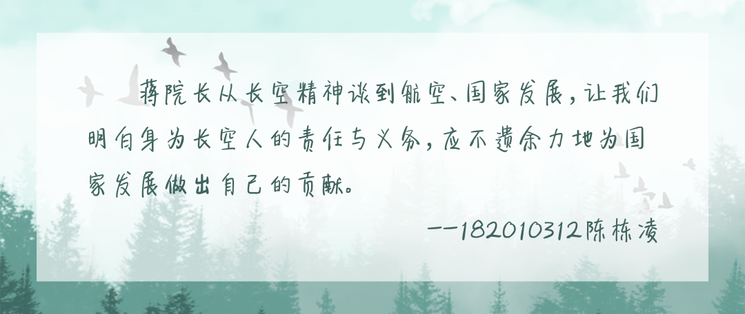 蒋院长还勉励同学们:南航因航空而生,而365英国上市公司官网以六个“一流“的标准为学生打造优良的学习成长环境,不仅仅是物质层面,更是文化精神层面的滋润;坚持大类培养,是期望同学们具备丰富的背景知识,实现各个学科的交叉交流;并且,”长空“是一种责任,一种光荣,更是一种担当,身为长空学子,就应当意志坚定,不要逃避,将困难视作人生迈进的支点,找到为之奋斗的兴趣,更要相信“天生我材必有用,千金散尽还复来”。