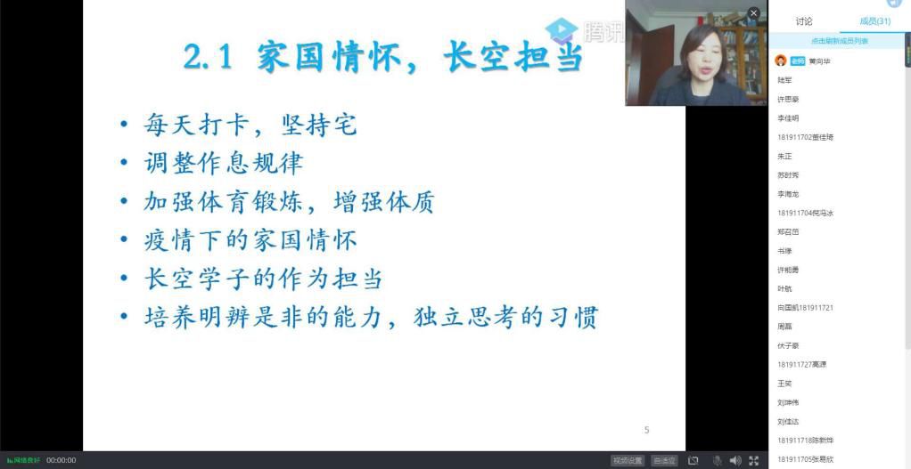 117班的班主任黄向华老师提出了疫情当下同学们应当具备的家国情怀和长空学子应有的担当,也对同学们新学期的学习提出了要求,除了课前主动预习课程内容,课后更要针对自己的疑惑与同学们积极交流并时常自我检测。
