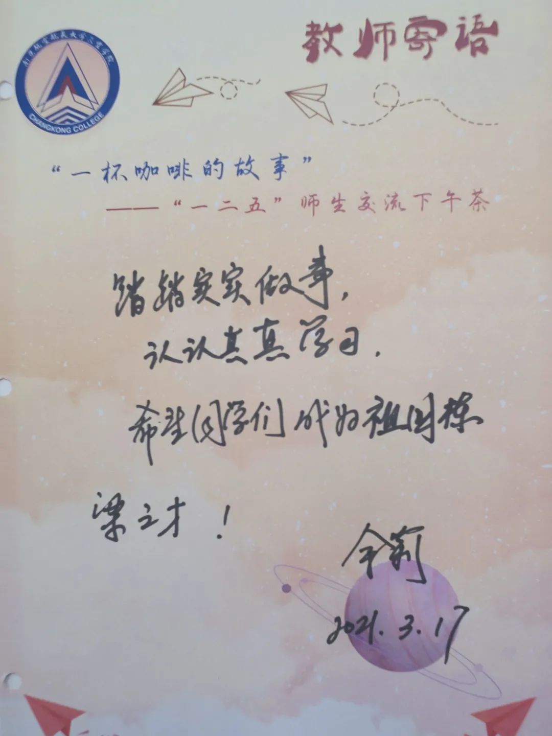 通过这次一杯咖啡的活动,我的许多迷茫疑惑都得到了解答,施校长用他丰富的知识和人生经验为我们指导方向,让我更加珍惜大学生活的宝贵,更加懂得学习机会的可贵!