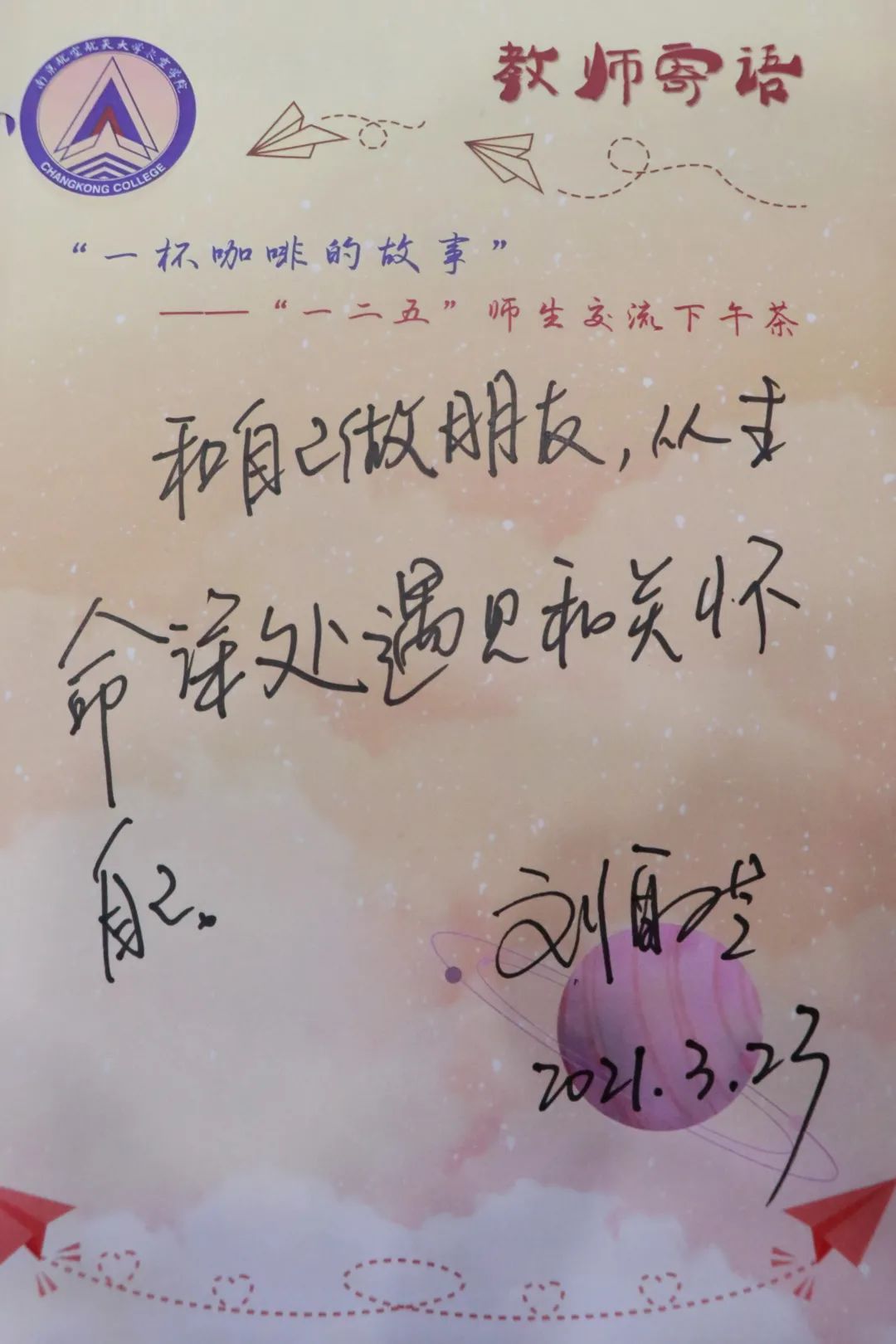 3月23号下午,河海大学心理健康教育与研究中心主任刘取芝教授做客 “一杯咖啡的故事”,与长空学子进行面对面交流。刘老师主要从学习、人际交往和情感交流三个方面解答了同学们的疑问,让同学们对很多常见问题有了崭新的理解。