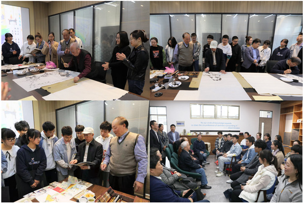 四位艺术家现场题字作画,寄语长空学子,并分享了自己的创作和生活经历。首先,在交流“从何时开始创作”这一问题时,张永荣老先生介绍了自己的创作经历,勉励同学们努力学习科学知识,为祖国的航空事业做贡献。他强调,“面对当今世界不了解、不认可中国传统艺术的现状,同学们要立志传播中国文化,将文化艺术与自身专业知识相结合,努力让中国传统文化走向世界”。