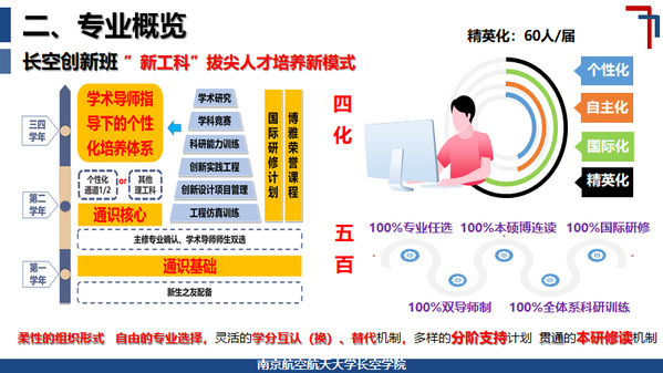 随后,蒋彦龙对365英国上市公司官网的培养特色进行了解读,航空航天大类培养和长空创新班的精英培养“双轨并进”、“相时而动”。航空航天类专业实施以突出数理基础、突出自主学习、突出核心课程、突出工程实践的 “四突出”培养体系,具有“厚基础”、“宽口径”、“显特色”、“强交叉”的显著特点,同时以航空航天类AI复合班培养适应航空航天和人工智能融合发展需要的复合型创新人才;作为拔尖创新人才培养的南航方案,长空创新班实行个性化、自主化、国际化、精英化的 “四化”培养模式,致力于培养具有家国情怀、使命担当、引领未来的高素质创新领军人才。