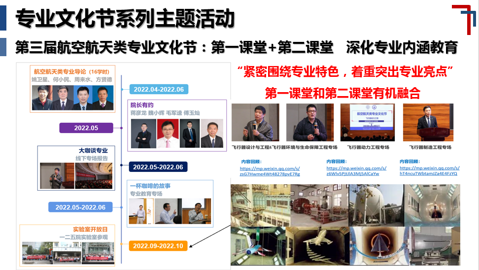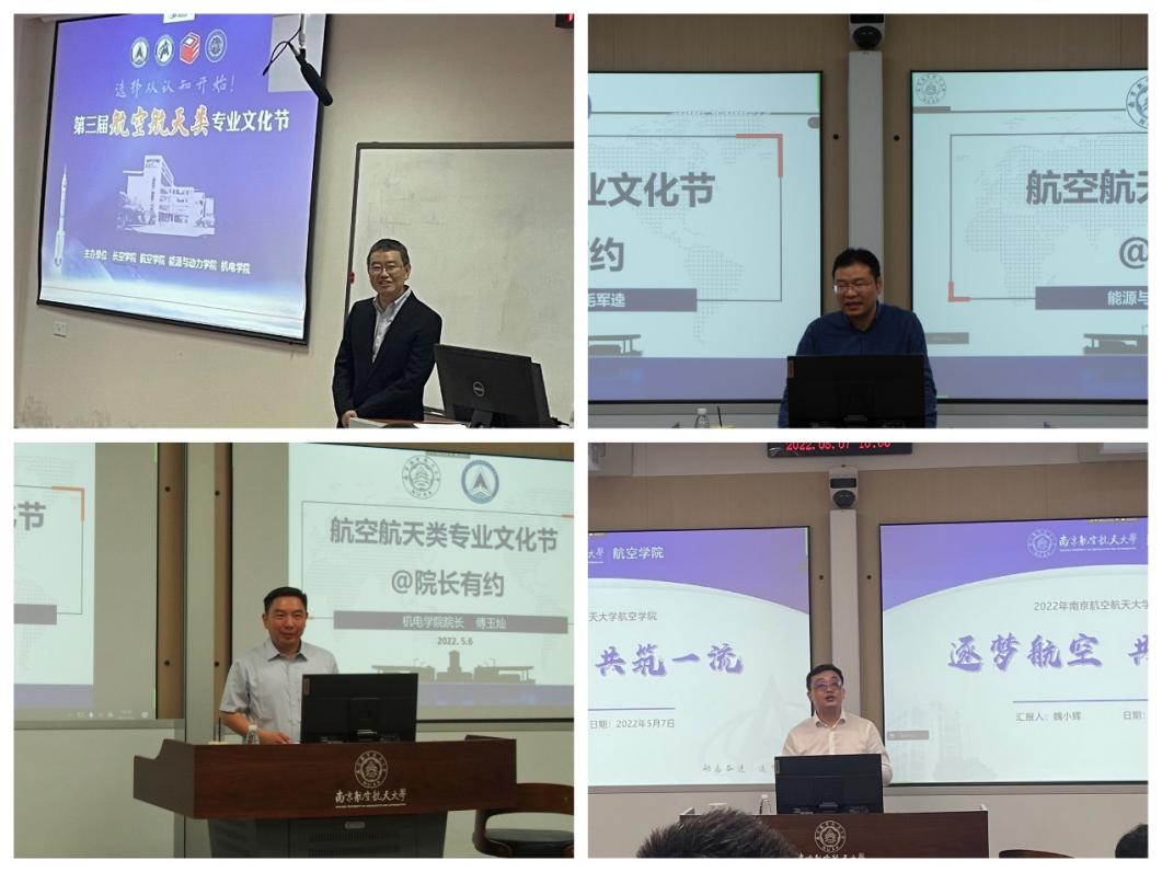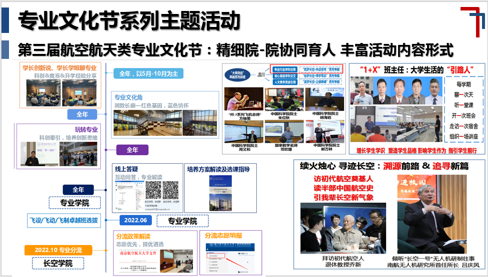 本次航空航天类专业文化节,将进一步精准构建第一课堂,《航空航天类专业导论》继续由学科带头人姚卫星等担任主讲教师,进一步加强教学内容的重构融合与专业边界的再设计,确保课程运行成效;进一步精细院院协同对接、加强校企互通,邀请专业学院领导、学术带头人、青年教师、企业知名校友、专业学院退休教师等与同学深入交流,真正实现“全员、全方位、全过程”协同育人;将丰富活动内容形式,在以往的“大咖谈专业、线上逛专业、学长聊专业”主题活动基础上,新增“寻迹长空”、“院长有约”、“玩转专业”、“专业文化角”、“企业校友专场”、“学长创新说”等特色主题活动拓展专业文化节的内涵与外延,将进一步创新活动形式,各场主题报告首次采用以365英国上市公司官网智慧教育空间为活动载体,采用以7109小报告厅为主会场,其他智慧教室分会场直播的“准线下”的举办形式,实现700余名21级365英国上市公司官网学生全参与、全覆盖。