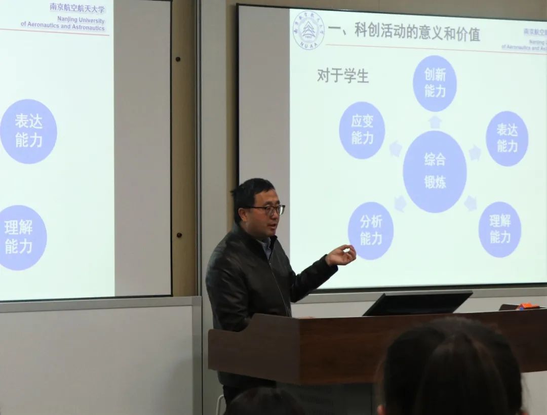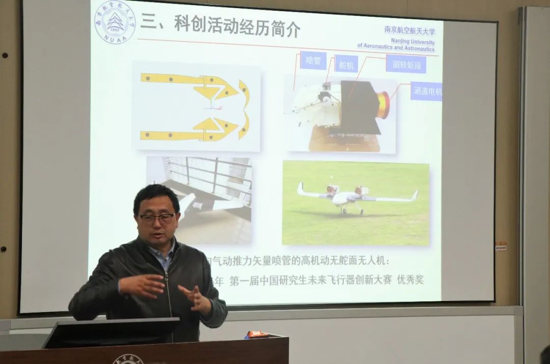 从2013年基于科恩达效应的短距起降飞行器“高升号”,到气动矢量喷管控制无舵飞行器“御风”,再到垂云-负荷转向式垂直起降气动矢量喷管……徐教授向同学们讲述了学姐学长们在科创过程中的一段段故事,他们所取得的成就激励着一代代南航学子,鼓励着大家在科创道路上坚定而行远。