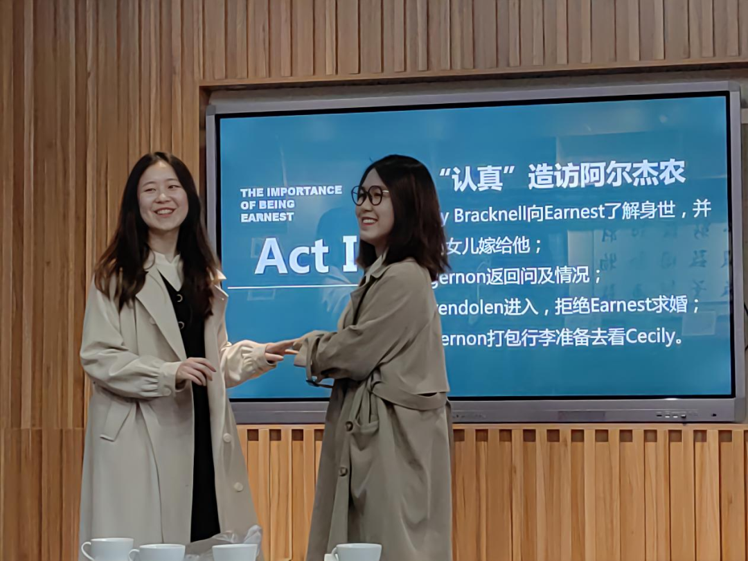 为了让同学们更直观地感受戏剧世界,王瑞瑒老师特别邀请了外国语学院的同学现场表演戏中片段。外国语学院同学们清晰的发音、自然生动的表演获得了观众们的好评和热烈的掌声。