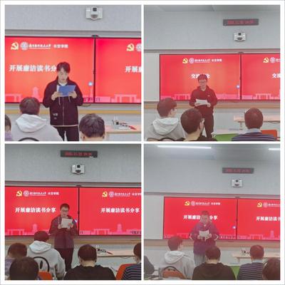 随后,各读书小组依次开展廉洁读书分享。“历览前贤国与家,成由勤俭败由奢”。第一小组在阅读《习近平关于党风廉政建设和反腐败斗争论述摘编》后,将书中内容与自身实际相结合,认为青年学生党员应坚守初心不改,牢记使命担当,为实现中国梦的伟大事业贡献力量。“一个故事胜过一打道理”。第二小组品读《廉政故事会》,故事虽然短小,内涵却十分深刻。该书收集历史上500多个精彩故事,古人追求贤廉的情怀蕴藏其间。“以铜为镜,可以正衣冠;以古为镜,可以知兴替;以人为镜,可以明得失”。“静以修身,俭以养德”。第三小组细读了《给年轻干部的21封信》。该书从历史、文化与人性的角度深析问题,围绕年轻干部的理想信念、廉洁自律、优良作风、个人经历等问题展开讨论,蕴含深意,耐人寻味;认为唯有奋斗才是幸福本身,奋斗的人生才有幸福可言。“清风两袖朝天去,不带江南一寸棉”。第四小组赏读《进阶吧,年轻干部》,该书主要针对年轻群体,是广大青年党员筑牢理想信念根基,守住拒腐防变防线,树立和践行正确政绩观的廉洁从政手册。