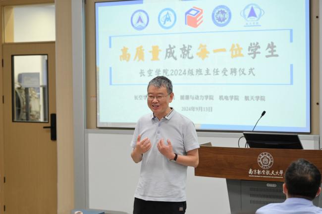 受聘仪式的最后,蒋彦龙做致辞总结。他代表学院向班主任团队表达诚挚感谢。他强调学生是南航最宝贵的财富,也是祖国最美好的未来,期待班主任在塑造价值、传授知识、培养能力、激发智慧等方面发挥更大作用。他表示学院将持续加强院院协同背景下“多主体参与、多要素融合、多生态共济”的准书院建设,全院教工将与全体新生班主任老师一起用心、用情、用智的指导、陪伴和关怀学生,以推动学生健康成长与全面发展。